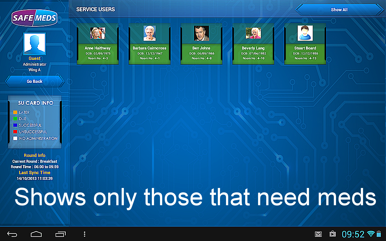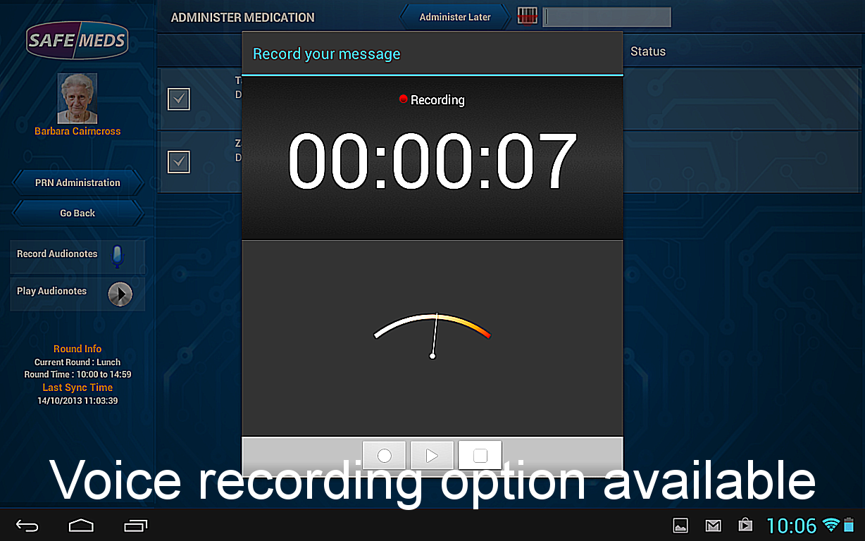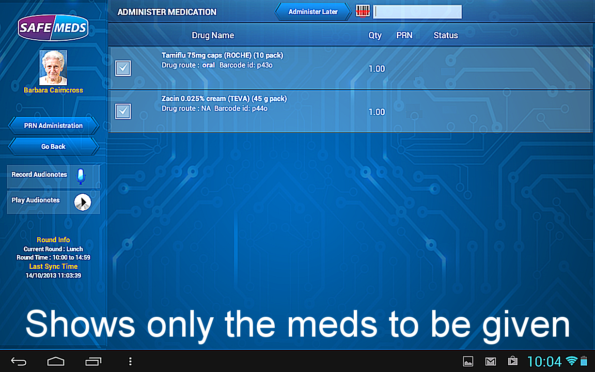 Select the service user select the drug and click. It can't be any simpler. SafeMeds will only show you the service user that needs medication and the medications that needs to be given at that time.