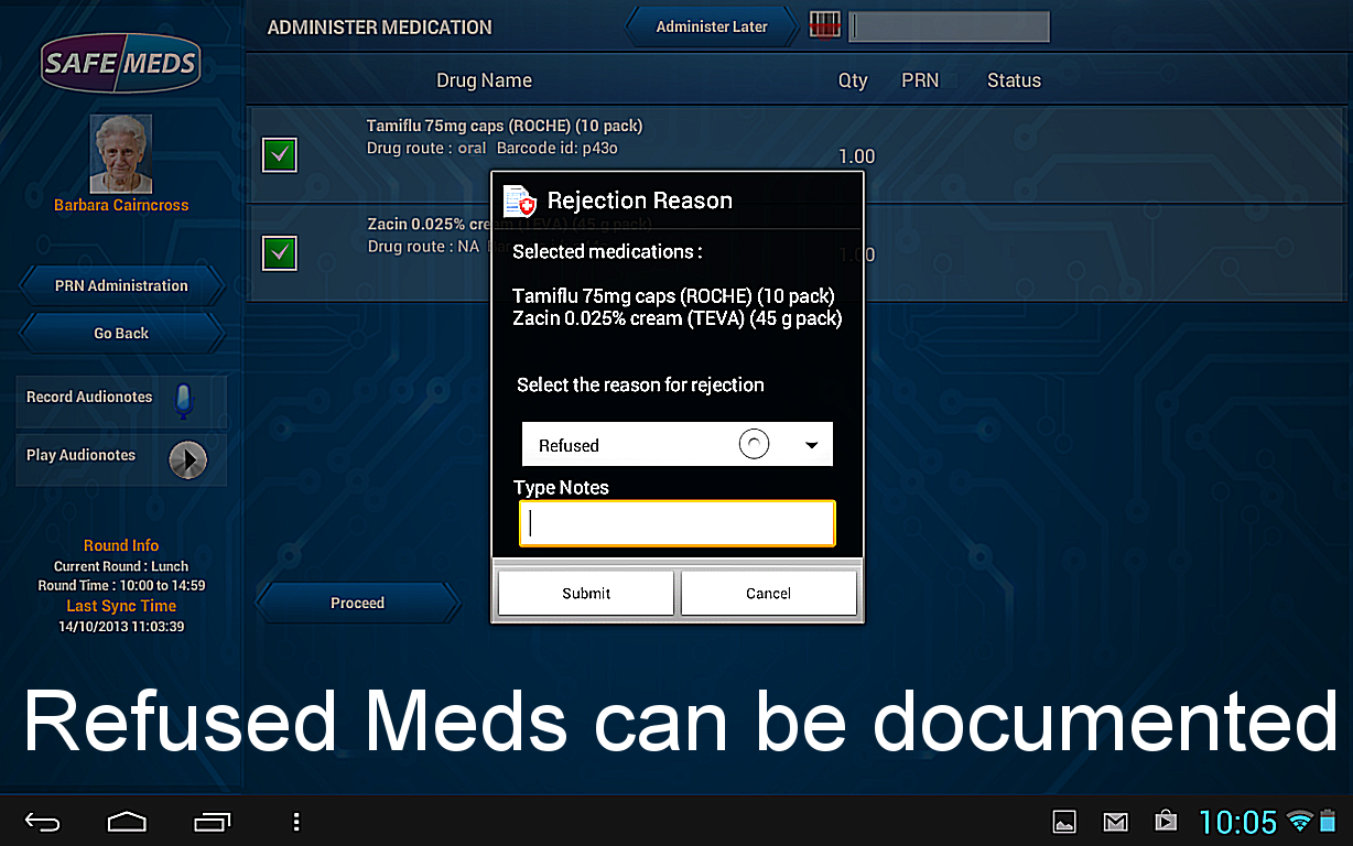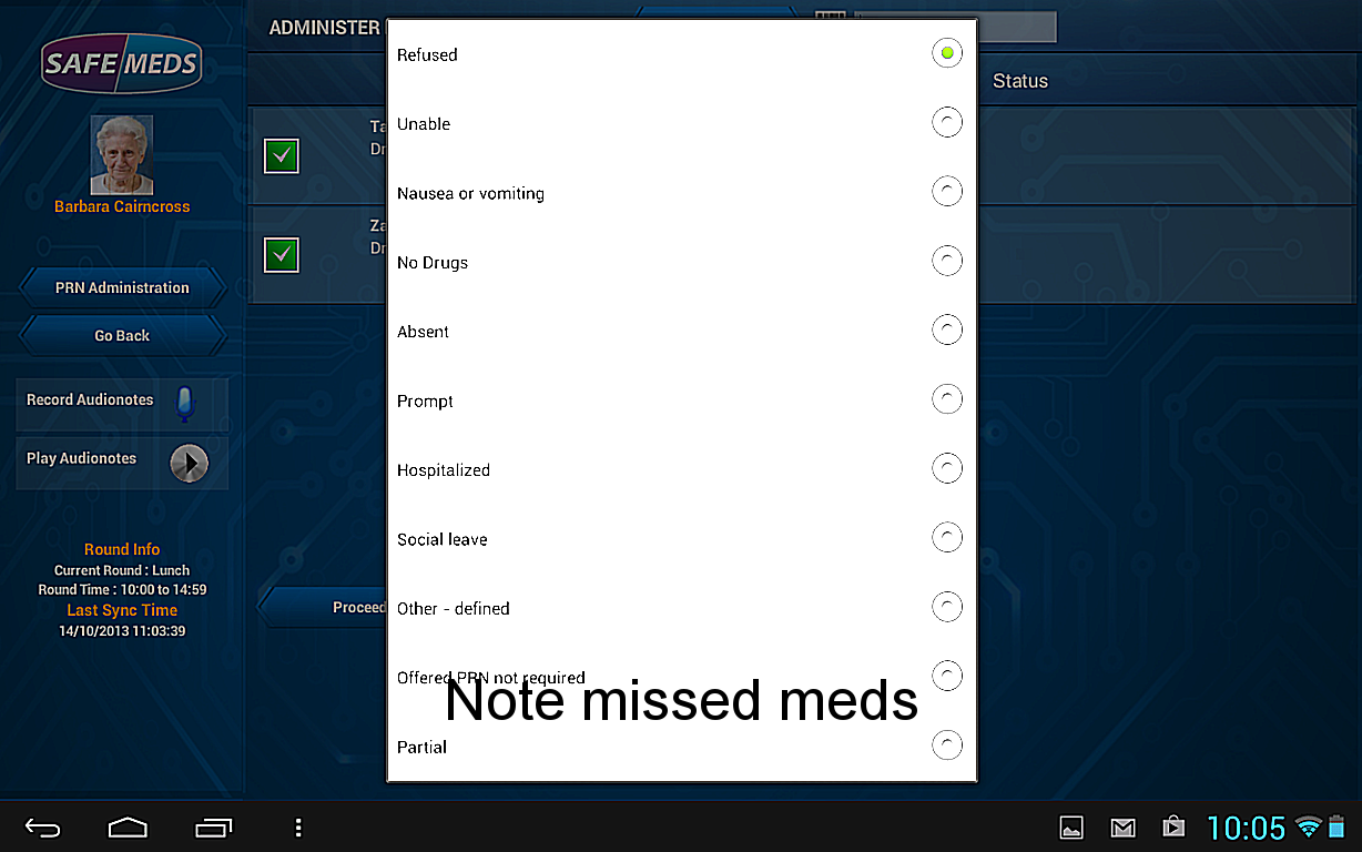 If the drugs are refused then SafeMeds will give you the option of returning to administer or to give a reason for the refusal. SafeMeds audit ability