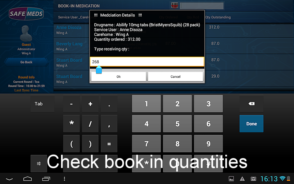 It could not be simpler, just select the service user and the drug and book in the quantity. SafeMeds will update your stock quantity